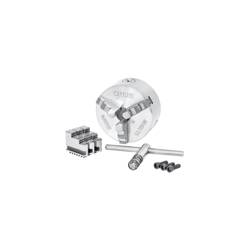 Il mandrino autoserrante di precisione FERVI M049A/125 è a guida singola, con griffe integrali e serraggio concentrico. Il mandrino per tornio è dotato di una serie da 3 griffe per interni, una serie da 3 griffe per esterni e una chiave di serraggio.