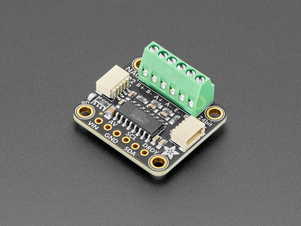 Componenti inclusi: chip ADC NAU7802, circuiti di supporto, quattro morsettiere per una connessione senza interruzioni dei sensori.