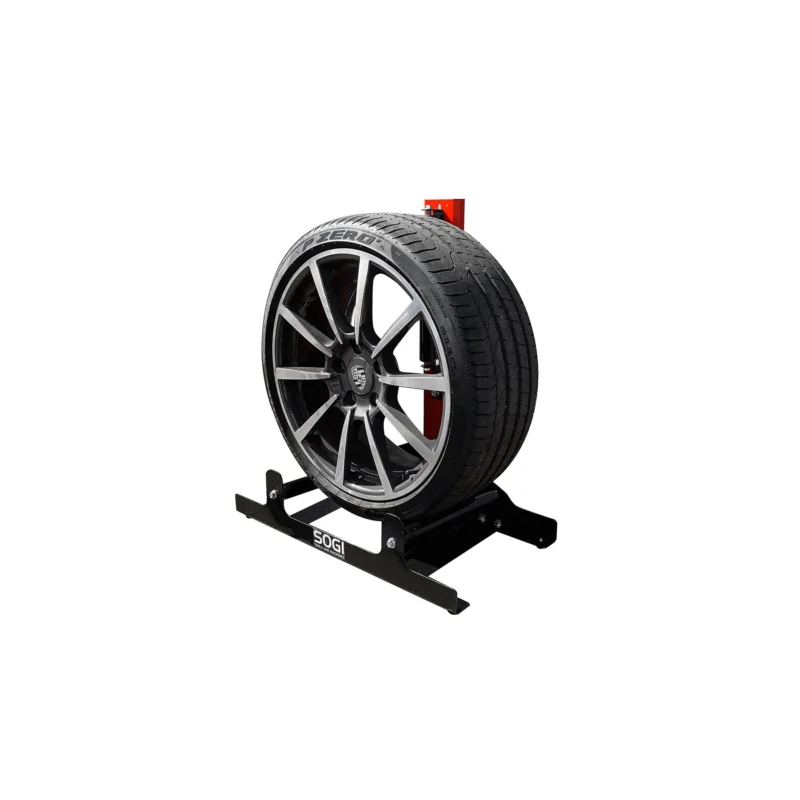 Il sostegno per ruota SOGU SU-ROT è costituito di 3 rulli, due disposti in orizzontale con una leggera inclinazione, ed un terzo disposto in verticale: i primi due fungono da appoggio per la ruota, mentre il rullo superiore è mobile e può essere regolato in funzione del diametro dello pneumatico o del cerchio.