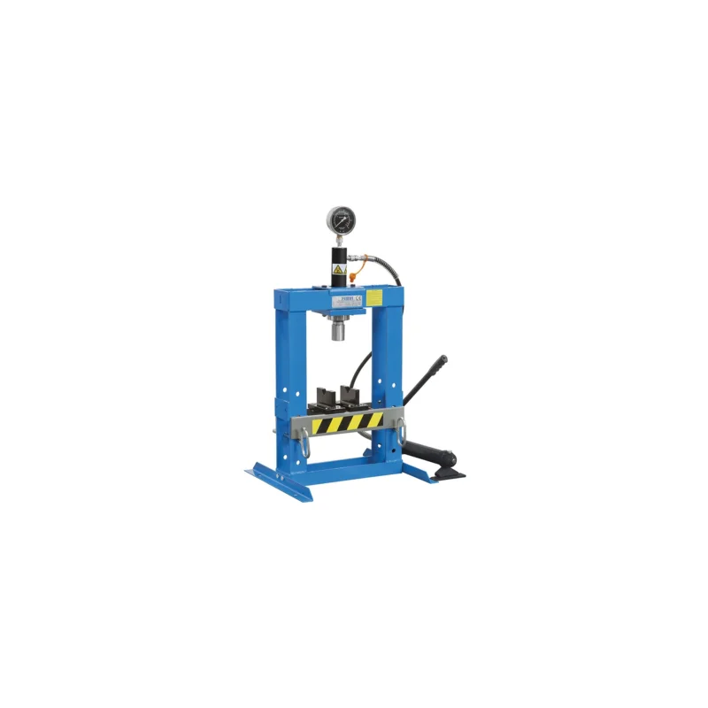 Benché l’area di lavoro disponibile non sia paragonabile a quella di una pressa destinata alla messa a terra, la pressa da banco 800VPG0986 si rivela tuttavia un’ottima scelta grazie ai valori raggiungibili di portata e pressione pari rispettivamente a 10 tonnellate e 69 MPa. La macchina è provvista di piedi d’appoggio che trasmettono elevata stabilità alla struttura e di un pistone idraulico mobile che consente la lavorazione di componenti di ogni genere.