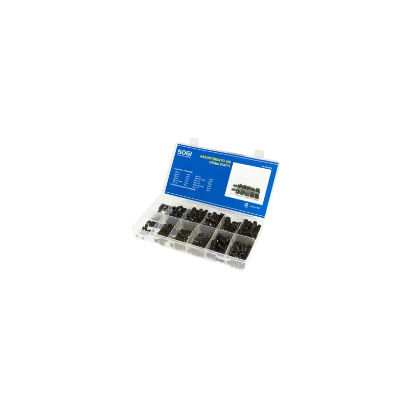 GRANI CON PUNTA PIATTA IN ACCIAIO MASCHIO DA M3 A M10 SUDDIVISI PER TIPO E DIMENSIONE ALL’INTERNO DI APPOSITA SCATOLA CON SCOMPARTI