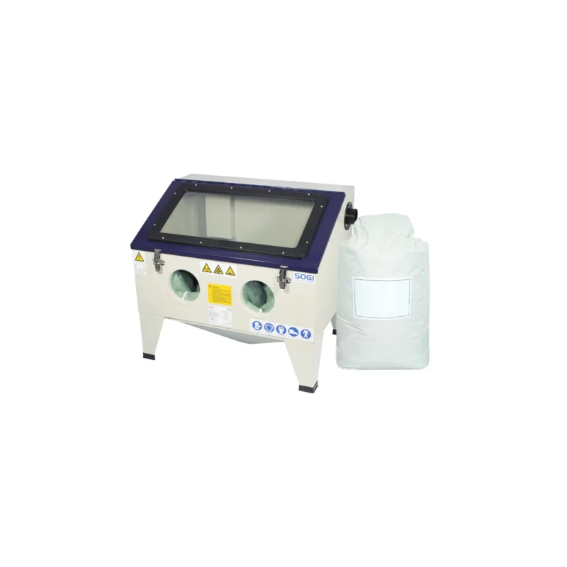 La sabbiatrice da banco SOGI S-72 è in grado di sabbiare, pulire e satinare le superfici metalliche, tramite un flusso in pressione di particelle abrasive secche, come microsfere di vetro o corindone. Nella lavorazione può presentare diversi gradi di finitura, variando la granulometria delle particelle abrasive e del tipo di particolari da lavorare, come pezzi in legno, motori, pezzi meccanici e altri metalli, plastiche etc.