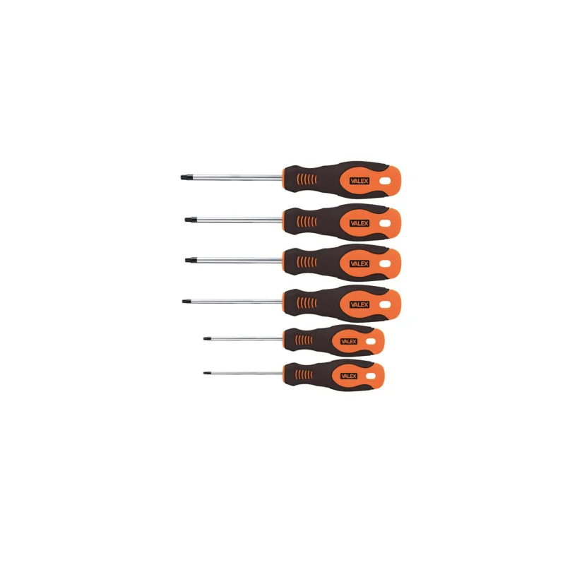 Il set VALEX 1463893 consta di ben 6 cacciaviti del tipo Torx: si tratta di utensili professionali caratterizzati da un incavo a forma di stella a sei punte. A differenza dei cacciaviti tradizionali con incavo esagonale, sono in grado di esercitare una coppia più alta disponendo di una maggiore superficie di lavoro.