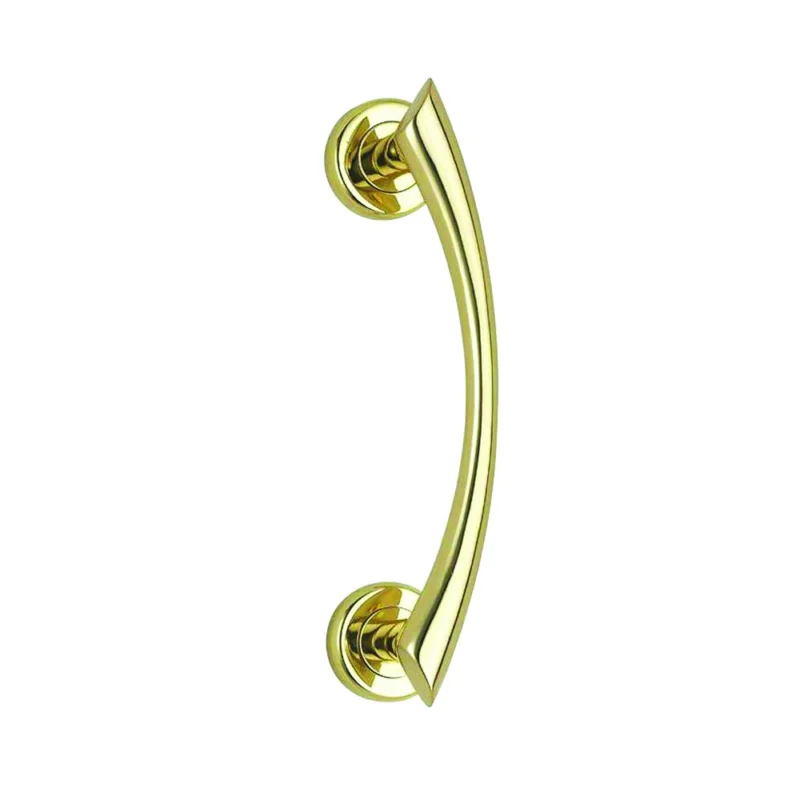 La finitura in ottone lucido, brillante e riflettente, valorizza il maniglione con un tocco di luce e prestigio, perfetto per ambienti classici, raffinati o di grande impatto visivo. L’interasse di 210 mm è studiato per garantire comfort nell’uso quotidiano, offrendo una presa salda e confortevole.