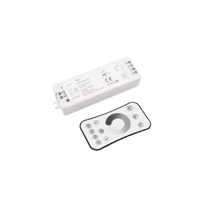 Controller + telecomando RF adatto per gestire strisce monocolore .Viene fornito completo di telecomando RF 2.4Ghz per gestire tutte le funzioni. Grazie a questo controller è possibile abbassare o aumentare l’intensità luminosa.