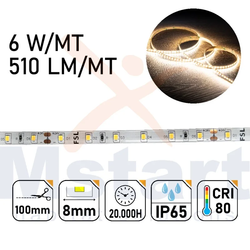 Striscia Led 6W/MT 24V PCB 8mm 300 Led SMD 2835 IP65 4000K 5MT Direttamente Dal Produttore