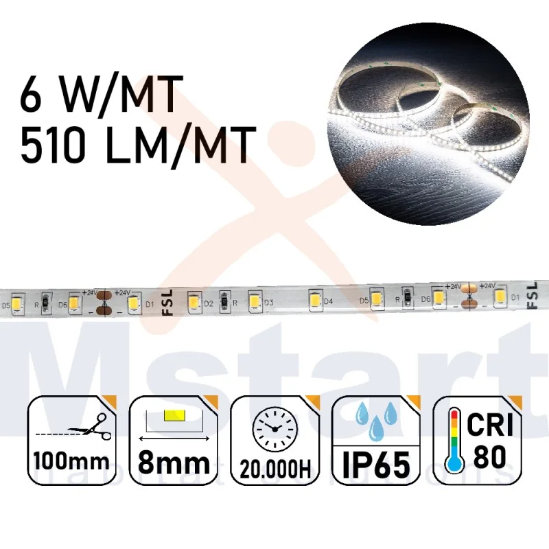 Striscia Led 6W/MT 24V PCB 8mm 300 Led SMD 2835 IP65 6500K 5MT Economico