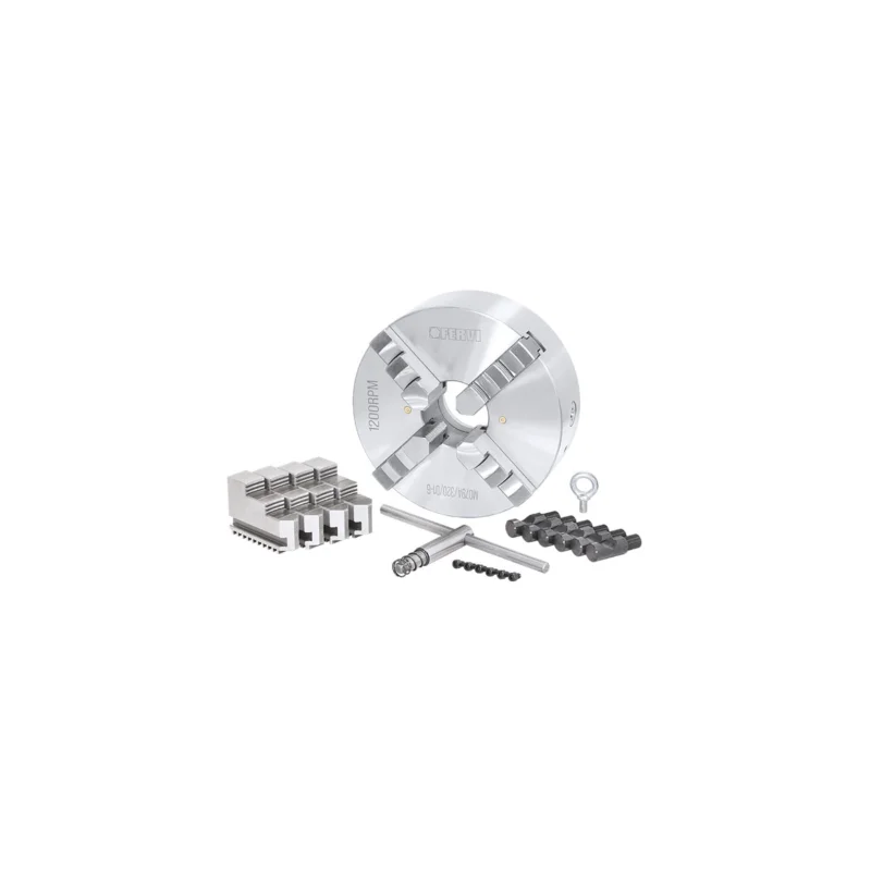 Il mandrino autoserrante di precisione con CAMLOCK D1-6 FERVI M079A/320/D1-6 è a guida singola, con griffe integrali e serraggio concentrico. Il mandrino per tornio è dotato di una serie da 4 griffe per interni, una serie da 4 griffe per esterni e una chiave di serraggio.