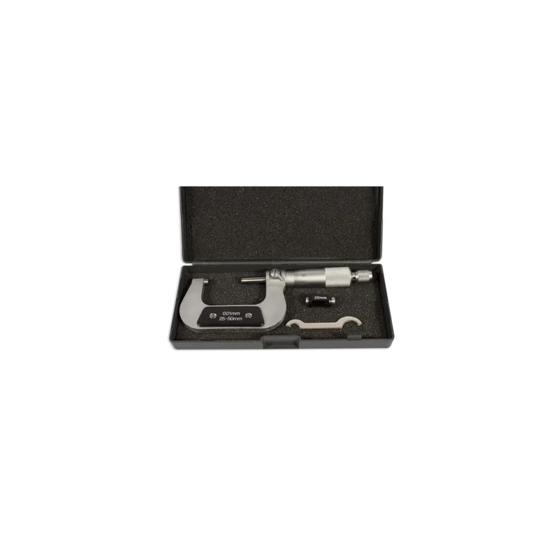 Il micrometro centesimale per esterni SOGI MIC-25-50 è uno strumento altamente professionale, ideale per officine e laboratori. Misura con precisione da 25 a 50 mm grazie alla scala centesimale, assicurando letture rapide e affidabili. Dotato di frizione, terminali cromati e contatti in metallo duro, garantisce durata e precisione costante.