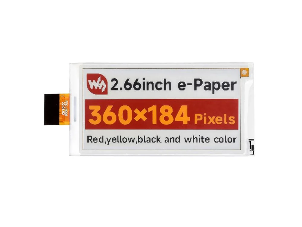 Scopri il vivace mondo del colore e della chiarezza con il display E-Paper (G) da 2,66 pollici, che offre una risoluzione di 360×184 pixel in rosso, giallo, nero e bianco sorprendenti.