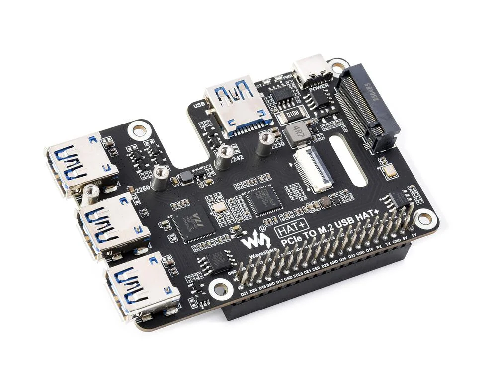 Waveshare PCIe A USB 3.2 Gen1 E M.2 HAT Per Raspberry Pi 5, Supporta Drive A Stato Solido Con Protocollo NVMe, Espande 4 Porte USB 3.2, Lettura / Scrittura Ad Alta Velocità, HAT+ Standard Prezzo Conveniente